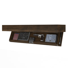 A discreet wall-mounted shelf designed to conceal valuables behind a hidden drop-down compartment while offering durable, everyday storage.