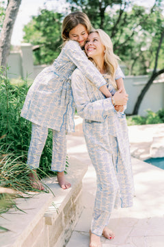 A lightweight cotton scalloped robe from Erin Donahue Tice, featuring a blue trellis pattern. Hand-blocked in Jaipur, India using stamps of the artist's original artwork. Features spacious side pockets and a matching belt