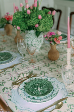 Elevate your table setting with the Erin Donahue Tice 100% Cotton Block Print Tablecloth, handmade in India using Erin’s original artwork.