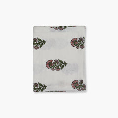 Featuring pink and green Mughal-inspired florals printed on crisp white linen, this runner adds heritage elegance to dining and display tables.