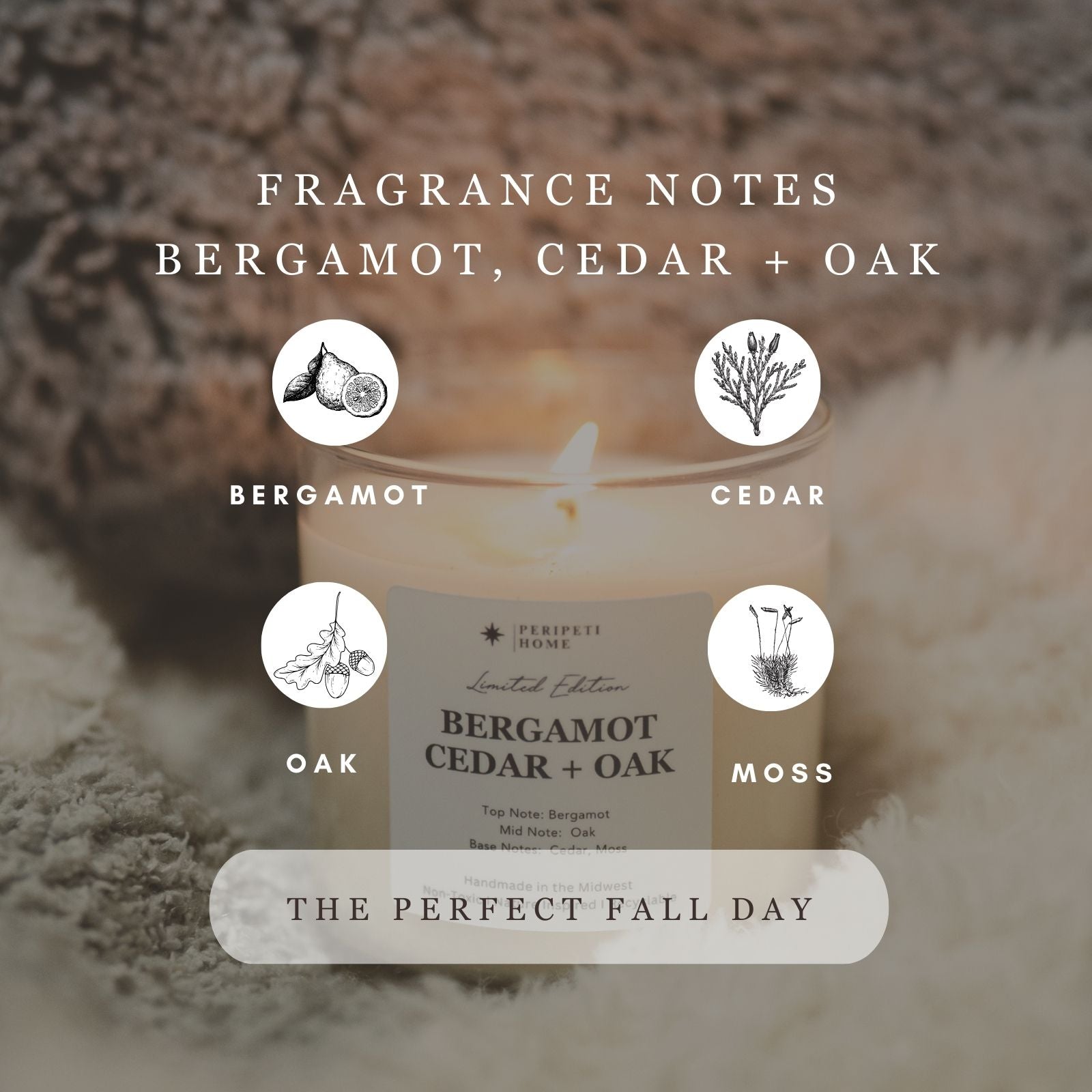 Welcome the newest addition to Peripeti Home's Fall Collection - Bergamot, Cedar + Oak. Celebrate the perfect Fall day. It’s the peak of the season, the air is cool and crisp, but the sun hasn’t yet lost its warmth. You look up and notice the brilliant collage of reds, yellows, and oranges.