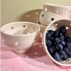 Each berry bowl is handcrafted, formed and pierced to create an easy, yet stylish way to rinse and eat your fresh berries. Please check the dimensions for size details!
