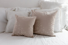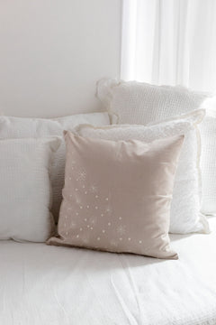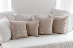 Bring a touch of whimsical charm to your home with these cotton cushion covers, featuring delicately hand-embroidered florals in the traditional Lambadi style. Set against a soft beige backdrop, the fine white thread work forms a gentle scattering of blossoms and dots — evoking the image of petals dancing in the wind.