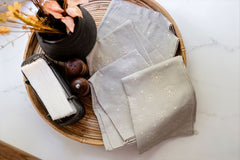 Elevate everyday rituals with these beautiful napkins/tea towels — a soft, graceful blend of function and artistry. Featuring hand-embroidered white florals scattered gently across a calming beige background, this set brings quiet charm to any kitchen or dining space.