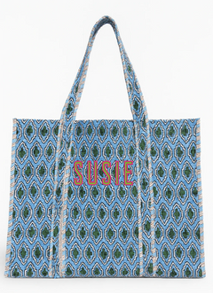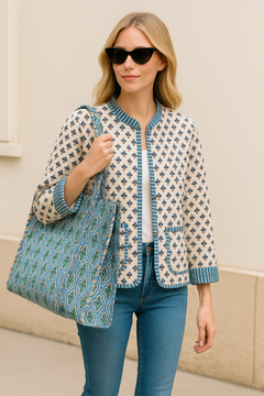 This 100% quilted cotton tote is hand block-printed and features internal pockets—perfect for everyday use or a weekend getaway.