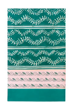 Handmade in India using Erin’s original artwork, each piece features natural variations from the traditional hand-stamped block-printing process. The round version includes a thick green scalloped trim, while the rectangular version features a coordinating block-print trim.