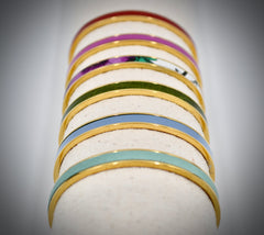 Anne-Marie created these unique 24K gold-plated, stainless-steel bracelets with colorful leather inserts.