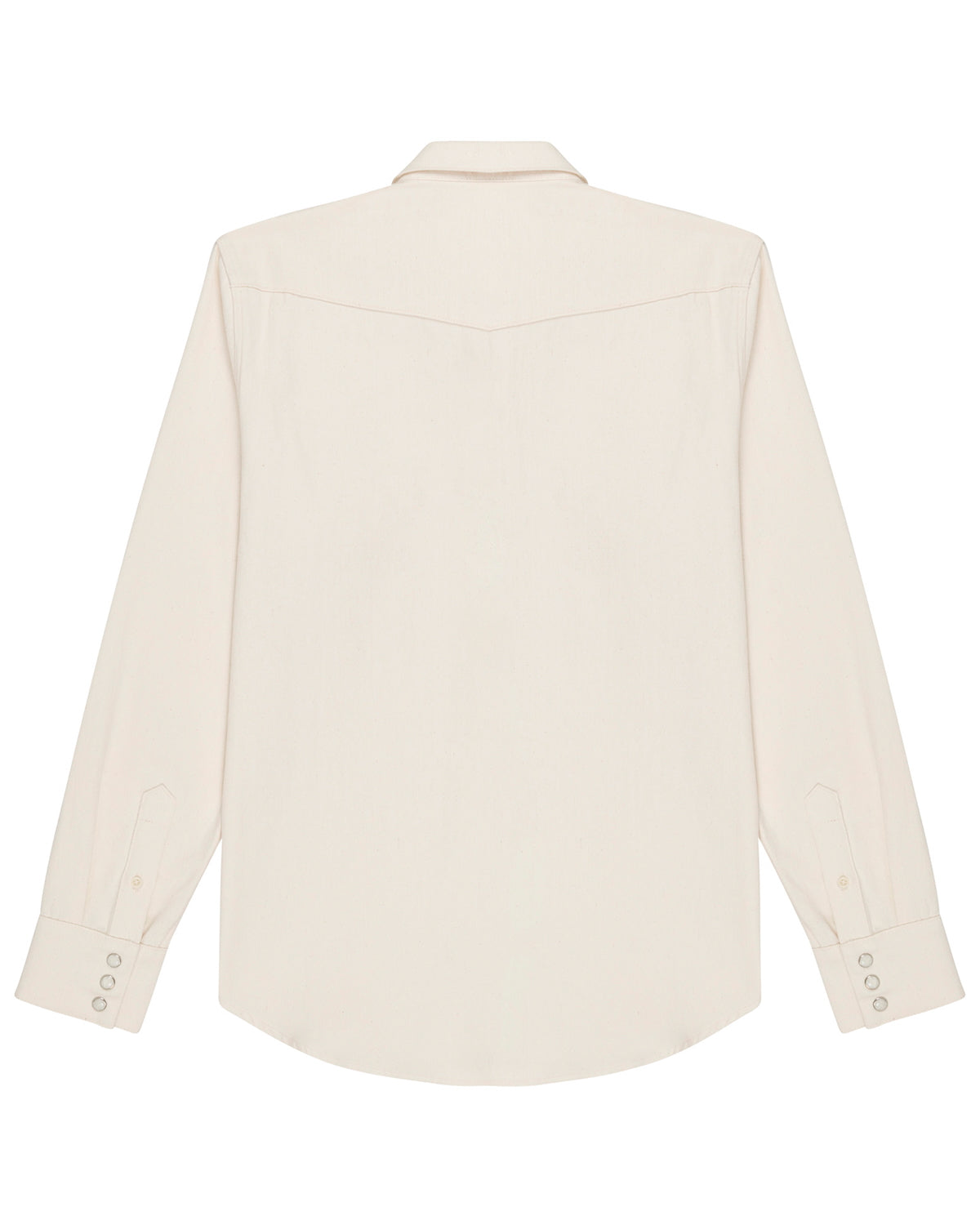 This 100% cotton ecru denim shirt offers a slim fit and timeless style. The 7 oz fabric is made from updyed cotton, retaining its natural color and texture. It’s finished with double chest pockets, western yokes, marble snaps throughout, and corozo buttons on the sleeve plackets and collar stand. Proudly made in the U.S.A.