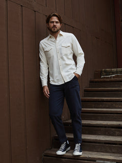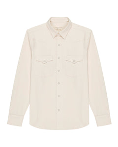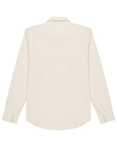 This 100% cotton ecru denim shirt offers a slim fit and timeless style. The fabric is made from updyed cotton, retaining its natural color and texture. Finished with double chest pockets, western yokes, marble snaps throughout, and corozo buttons on the sleeve plackets and collar stand.