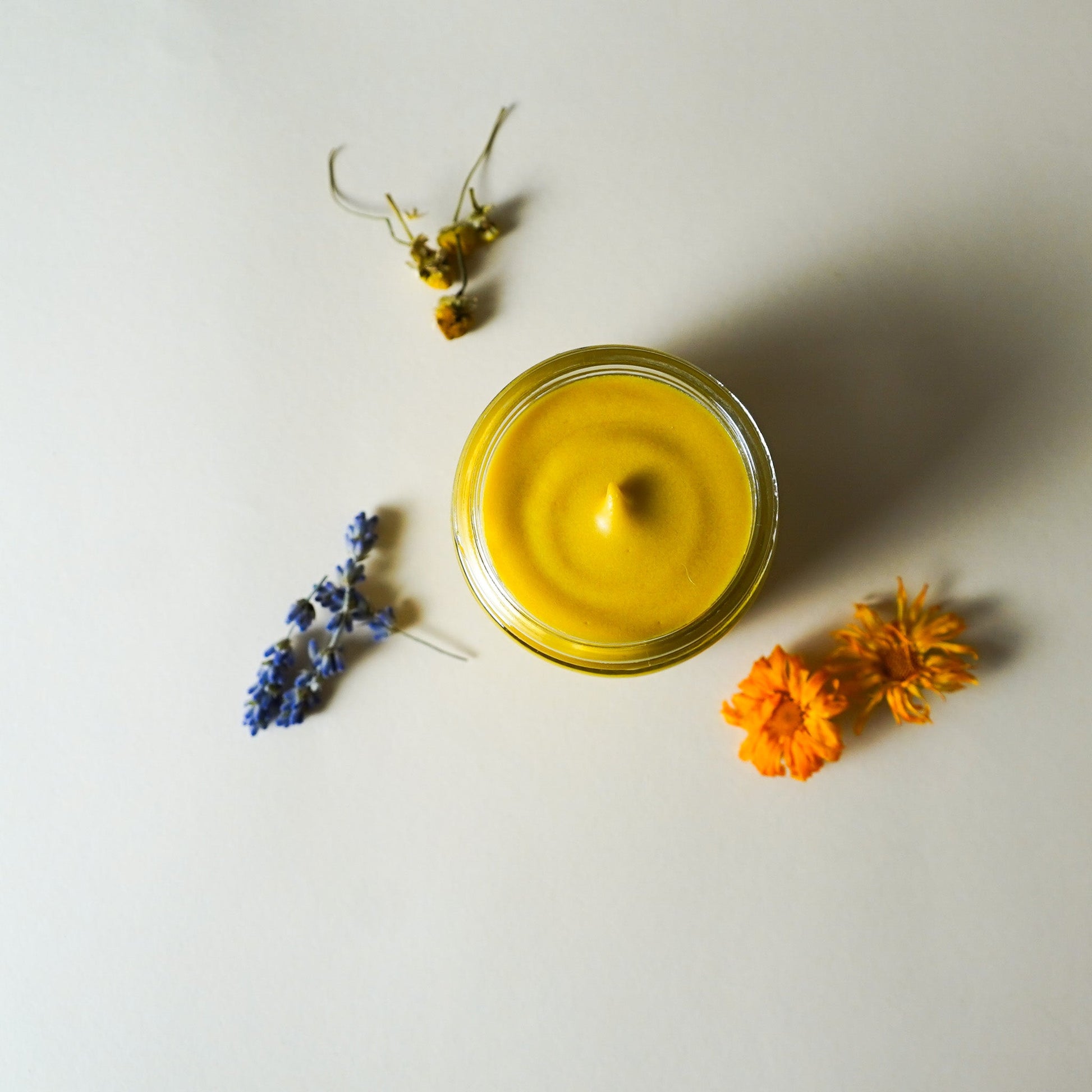 Chamomile-Infused Jojoba, Olive, & Avocado Oils: Calms redness, fights free radicals, and supports skin cell regeneration.
