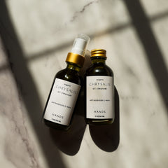 Chrysalis was inspired by the monarchs who visit Hands Organic's registered Monarch waystation, resting and feeding on the echinacea. The final formula emerged with the same soft green hue as a real chrysalis, a quiet affirmation of its purpose: to restore, protect and prepare - like the monarch’s chrysalis, a tender shell where transformation begins.