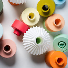 Meet Cici: a colorful, playful table lamp with modular stackable bases and a pleated matte shade. Designed for endless creativity, the Cici Lamp arrives fully assembled and ready to glow, but every base can be swapped or stacked with others to create new color-blocked combinations.