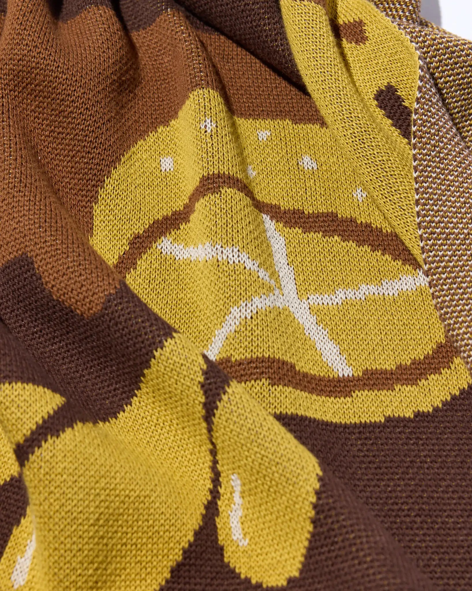 Bring a touch of stylish storytelling to your home with the Judit Zengovari “Citrus Cocktail Cat” Knit Blanket, featuring a sleek cat observing a vibrant cocktail scene.