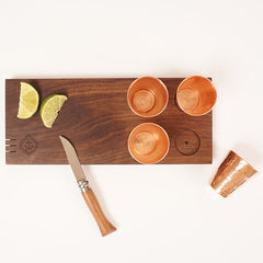 The Sailor Wood Shot Serving Board & Copper Shot Glasses from Sertodo is a collaboration with local Austin makers, Son of a Sailor, combining natural wood and hand-forged copper for a luxurious bar experience.