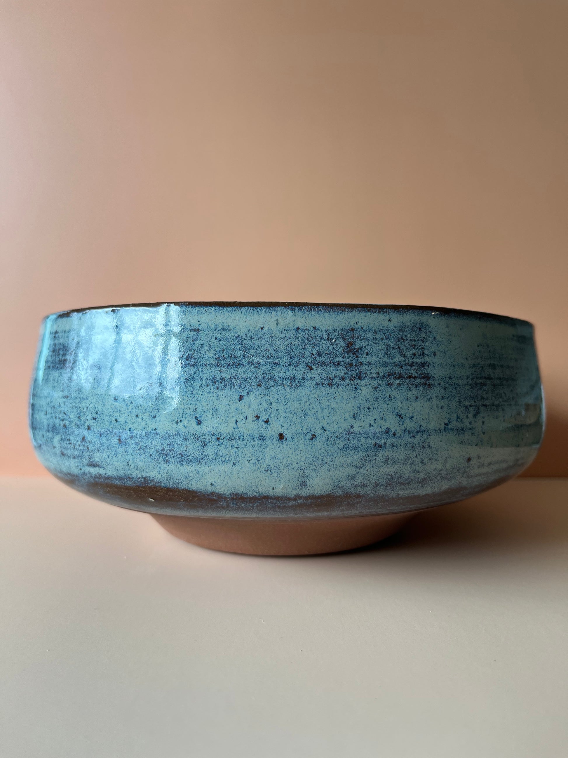 This bowl was shaped on the potter's wheel using a rich red stoneware clay. It is coated with a hand-applied crescent teal glaze, resulting in a one-of-a-kind finish that is truly unique.