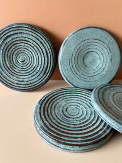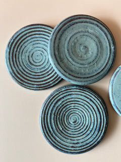 These Coasters were shaped on the potter's wheel using a rich red stoneware clay. They are coated with a hand-applied crescent teal glaze, resulting in a one-of-a-kind finish that is truly unique.