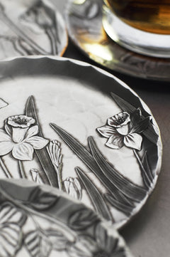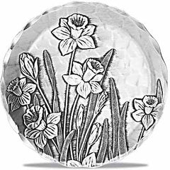 Hand hammered in aluminum with a cheerful daffodil design, this coaster adds a touch of spring freshness to any table while protecting surfaces. Perfect for everyday use or as a thoughtful gift.