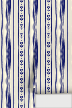 A playful floral stripe wallpaper by Samantha Santana combining soft beige and airy blue tones for a fresh, cottage-inspired look.