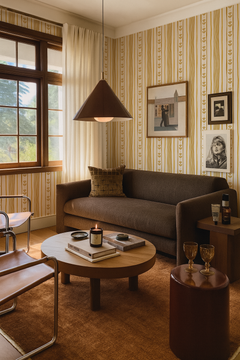 A charming floral stripe wallpaper by Samantha Santana featuring soft beige and sunny yellow tones for a warm cottage-inspired look.