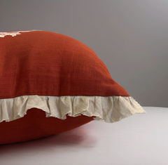 Unveil a world where New England’s fall foliage meets the the serenity of Indian deserts and the grace of Jasmine flowers. This rust orange cover is adorned with soft ruffles on the edges, blending simple sophistication with a comforting warmth.