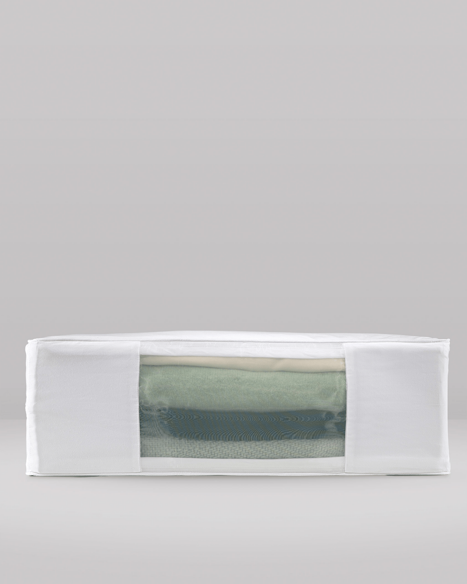 The bag measures approximately 15 inches long by 20 inches wide by 6.5 inches tall and is designed to hold up to nine thin sweaters, four blankets, or one large comforter.