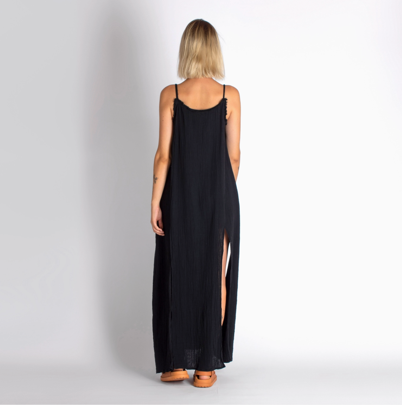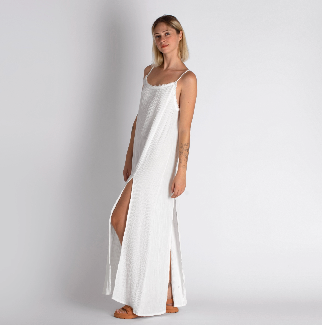 Elevate your summer wardrobe with this chic maxi dress. Featuring four skirt slits, this versatile piece can be used as your go-to beach cover-up or a for a summer night out with friends.