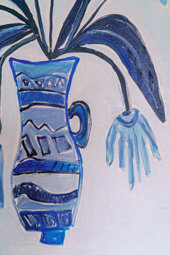 This is an original mixed media monochromatic botanical painting created by Erin Donahue Tice. Measuring 48" x 36" inches, it showcases a striking arrangement of blue blooms gathered in a coordinating blue vase.