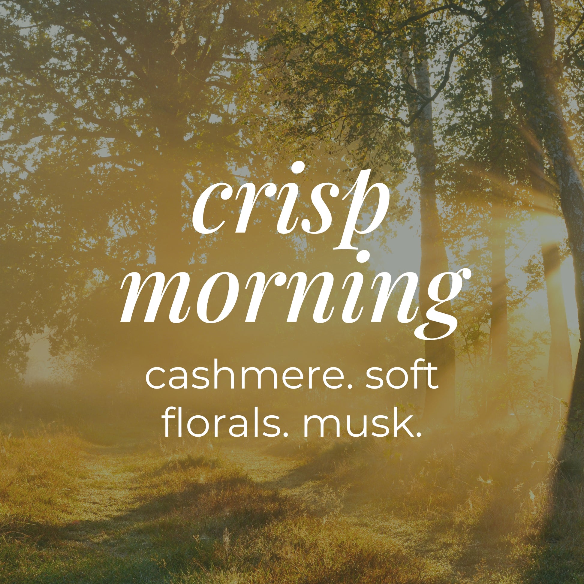 Crisp Morning features notes of cashmere, soft florals and musk and is inspired by a cozy sweater, walks among the leaves, the crunch of pinecones and fall’s crisp welcome.