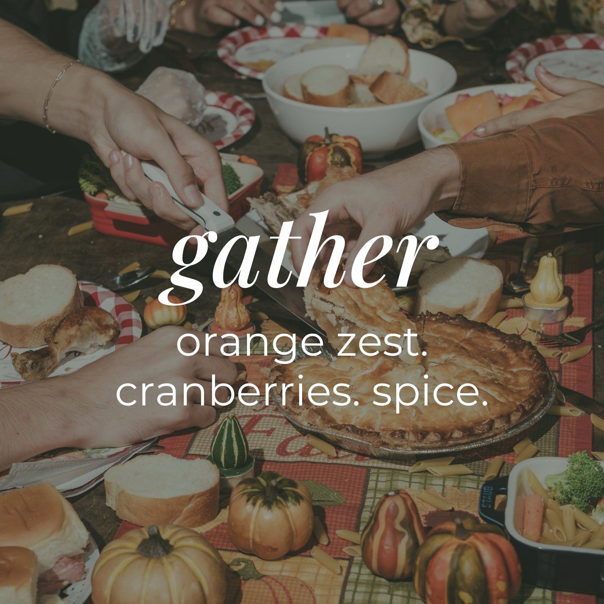 Gather features notes of features notes of orange zest, cranberries and spice and is inspired by a cool breeze, everyone gathered ‘round the table, all the autumnal treats and the love of family.