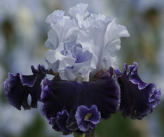 Make a bold statement in your garden with the Feel The Thunder Tall Bearded Iris. This striking neglecta variety showcases a captivating contrast between its light blue standards and rich ink-blue falls, accented by softly ruffled wisteria-blue undersides. Standing tall at 43 inches, each stem carries three branches—some double-socketed—producing up to seven large, fragrant blooms.