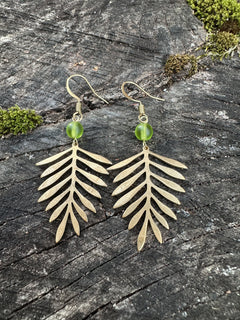 A gentle meeting of forest and sea, these fern dangle earrings pair botanical form with the soft glow of green sea glass. The delicate leaf design brings an organic, flowing shape, while the glass bead adds a subtle hint of color and light.
