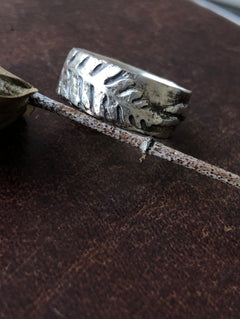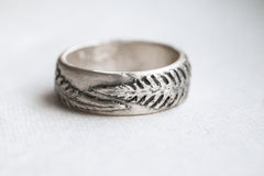 A delicate expression of nature and connection, this fern ring band features two graceful fronds meeting at the center—symbolizing unity and growth. Inspired by Maine’s native ferns, the design captures their flowing shape and intricate texture in a timeless, wearable form.