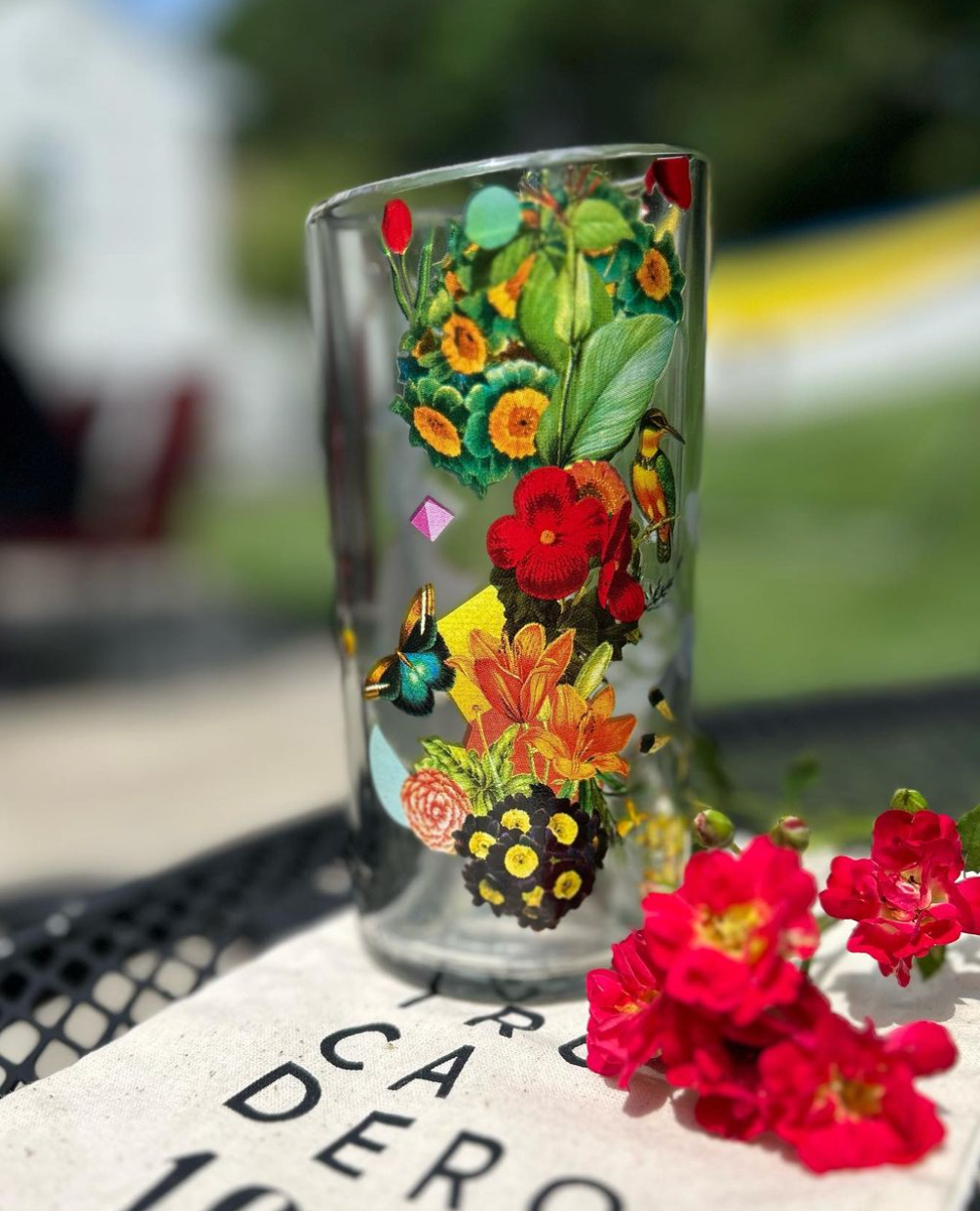 The Trocadero 1903 Flowers glasses are handmade from up-cycled rosé bottles. These floral glasses bring a touch of vibrant color to your everyday kitchen.
