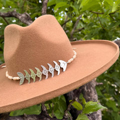 Add a splash of whimsy and handcrafted charm to your hat with the Fish Skeleton Hat Band by Adriana Soto. Each piece features hand-cut and hammered aluminum fish skeletons paired with fossilized white coral beads and wooden accents. Adjustable and customizable, this unique hat band brings a playful touch of nature-inspired artistry to any outfit.