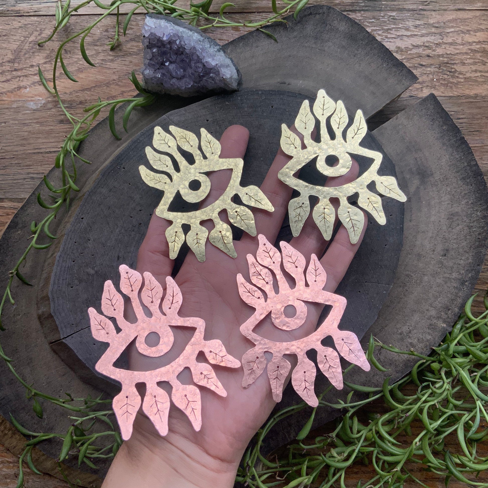 - Hand-drawn, hand-cut, and hammered surreal eye design with plant eyelashes