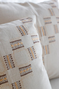 Crafted from natural-toned cotton, these cushion cover features a striking diagonal pattern of Lambadi hand embroidery in muted ochres and browns (earthy pigments). The geometric stitchwork, inspired by traditional Lambadi motifs, showcases the community’s artistry with a modern twist.