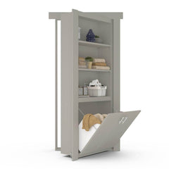 A flush-mount hidden hamper door that turns a standard doorway into discreet laundry and storage space, offering up to 20 cubic feet of built-in organization in a clean, paint-grade finish.