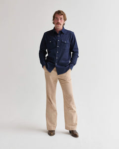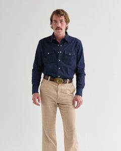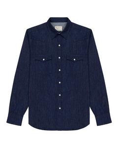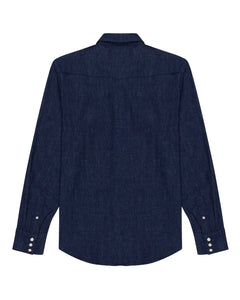 Made from 100% cotton indigo denim, this shirt delivers a tailored slim fit with lasting comfort. It features double chest pockets, front and back western yokes, and black marble snaps throughout.