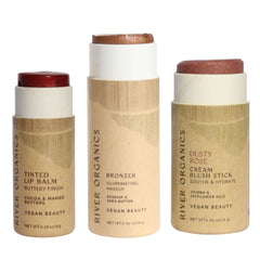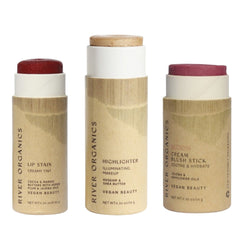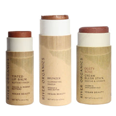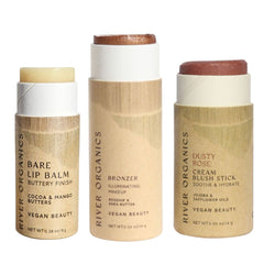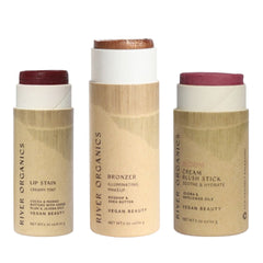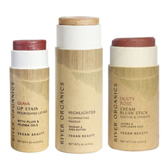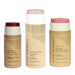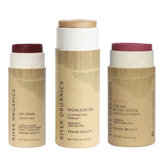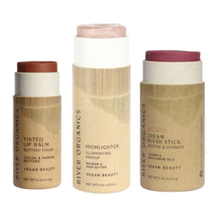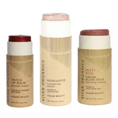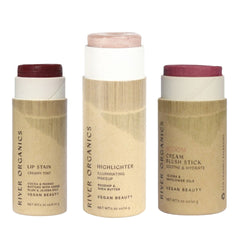 Discover the perfect trio of clean beauty essentials with River Organics customizable Lip + Highlighter + Blush Set. Choose one lip product, one highlighter or bronzer, and one blush stick to create your ideal everyday routine.