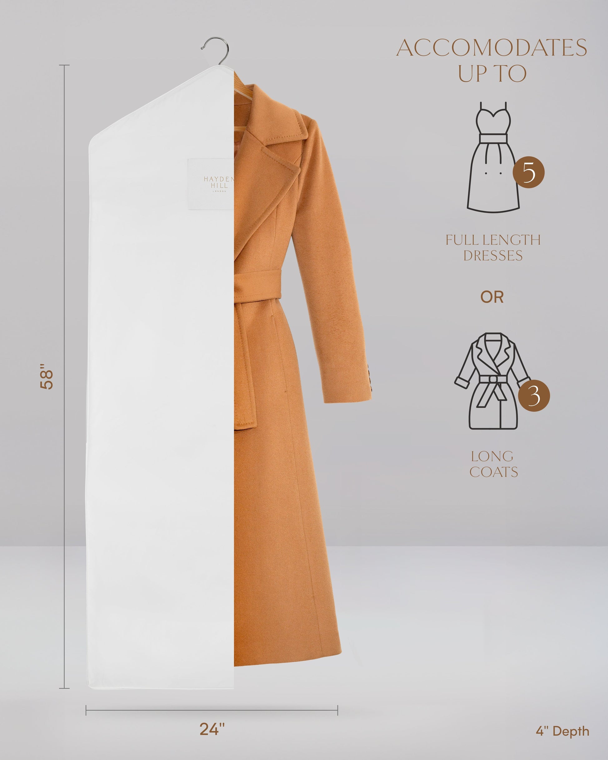 The bag measures approximately 58 inches long by 24 inches wide and features a 4-inch gusset, allowing it to hold up to five full-length dresses or three coats, depending on garment thickness.
