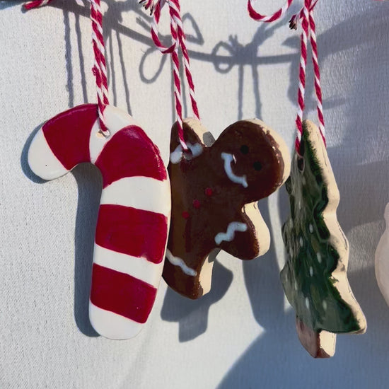 Shop this handmade, hand painted set of five unique Christmas ornaments for a limited time. Featuring one Candycane, one Christmas Tree and one Snowman, and two Gingerbread Men!