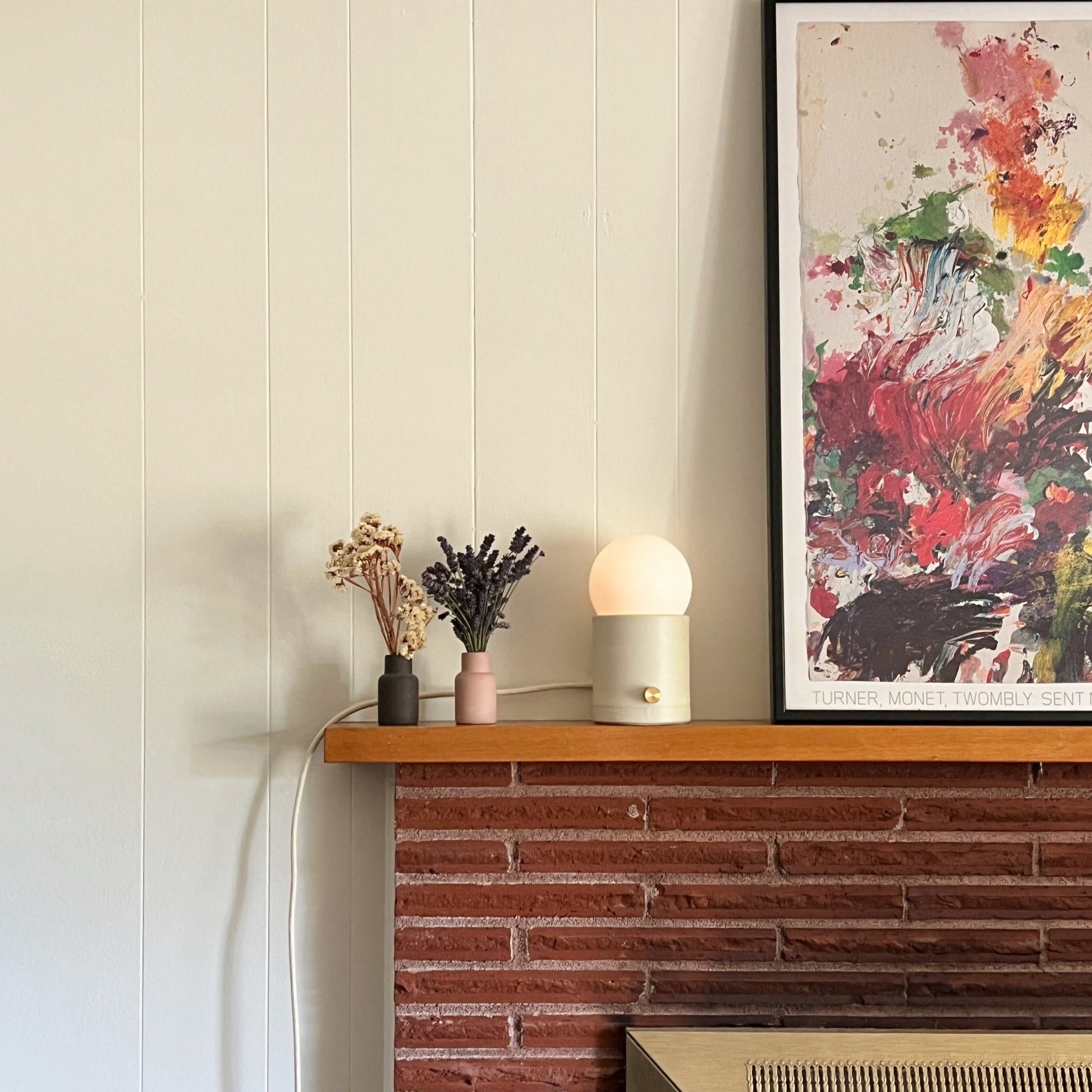 The Mini Pillar Lamp is VESSEL's modern take on a living room essential. A large, dimmable LED globe bulb sits atop our hand thrown ceramic base. The Mini Pillar is about half as tall as the original Pillar Lamp - perfect for smaller spaces. Turn the brass knob to turn the lamp on/off and dim to your preference.