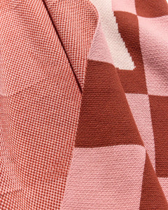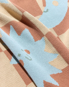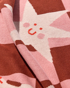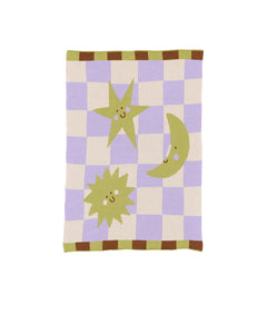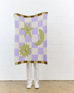 Biquette’s Sleepy Celestial Blanket features Rosie Caitlin’s dreamy celestial faces on a cozy checkered background.
