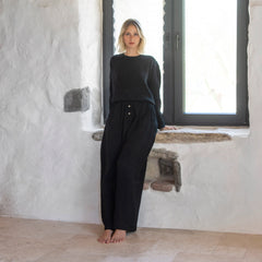 The highly elastic waistband is accompanied by buttons on the front of the pants and pairs perfectly with the Muslin Buttoned Shirt.