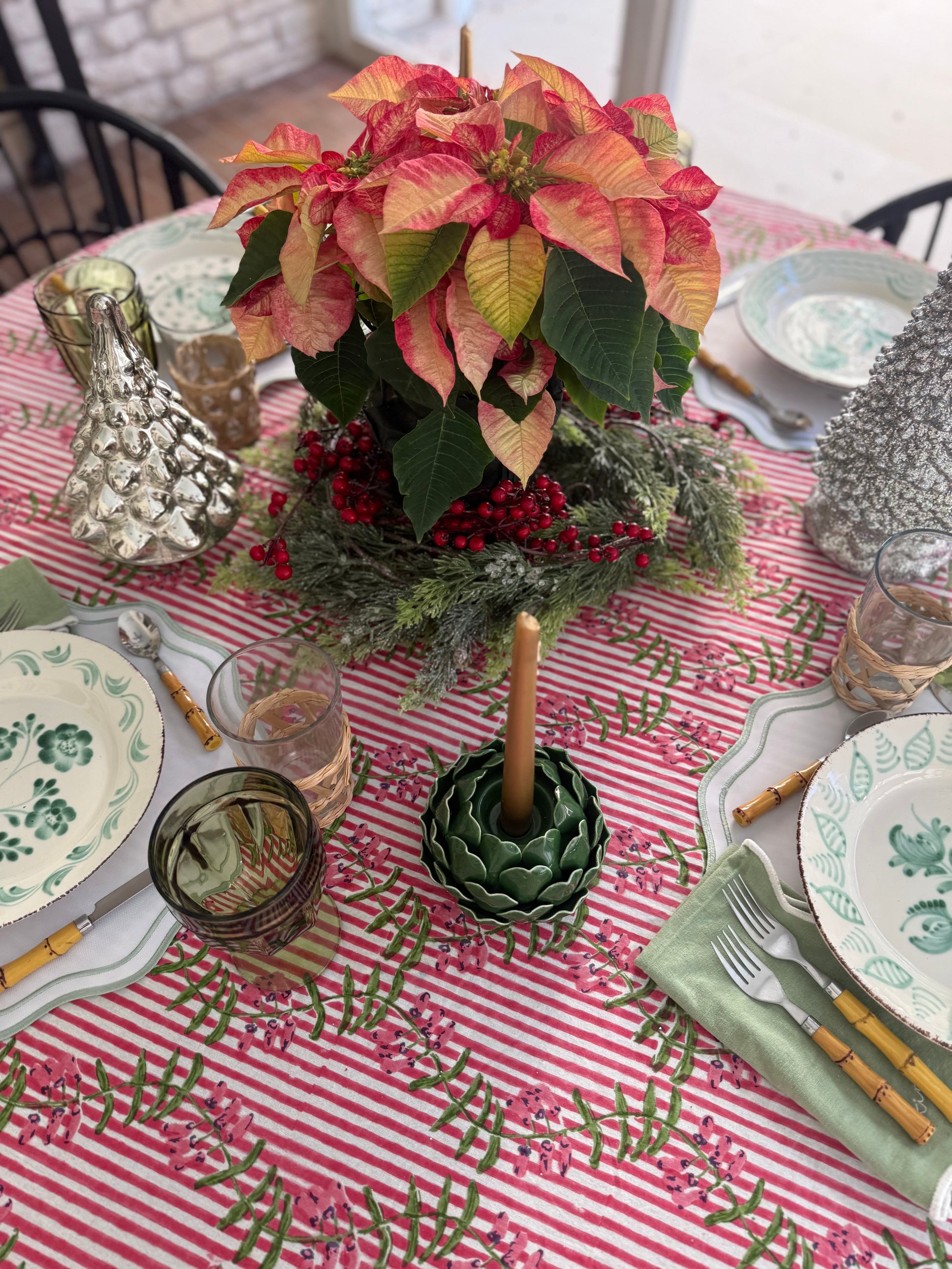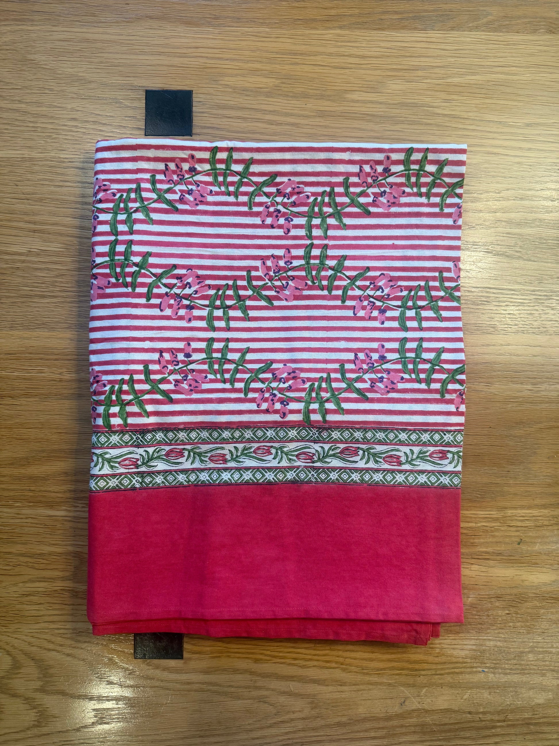 Brighten your table with the Erin Donahue Tice 100% Cotton Block Print Tablecloth, featuring deep pinkish-red, white, and green hand-stamped motifs.