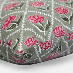Featuring rose motifs in olive and pink on pure linen, this hand-block printed pillow cover blends royal Indian floral inspiration with modern sophistication.