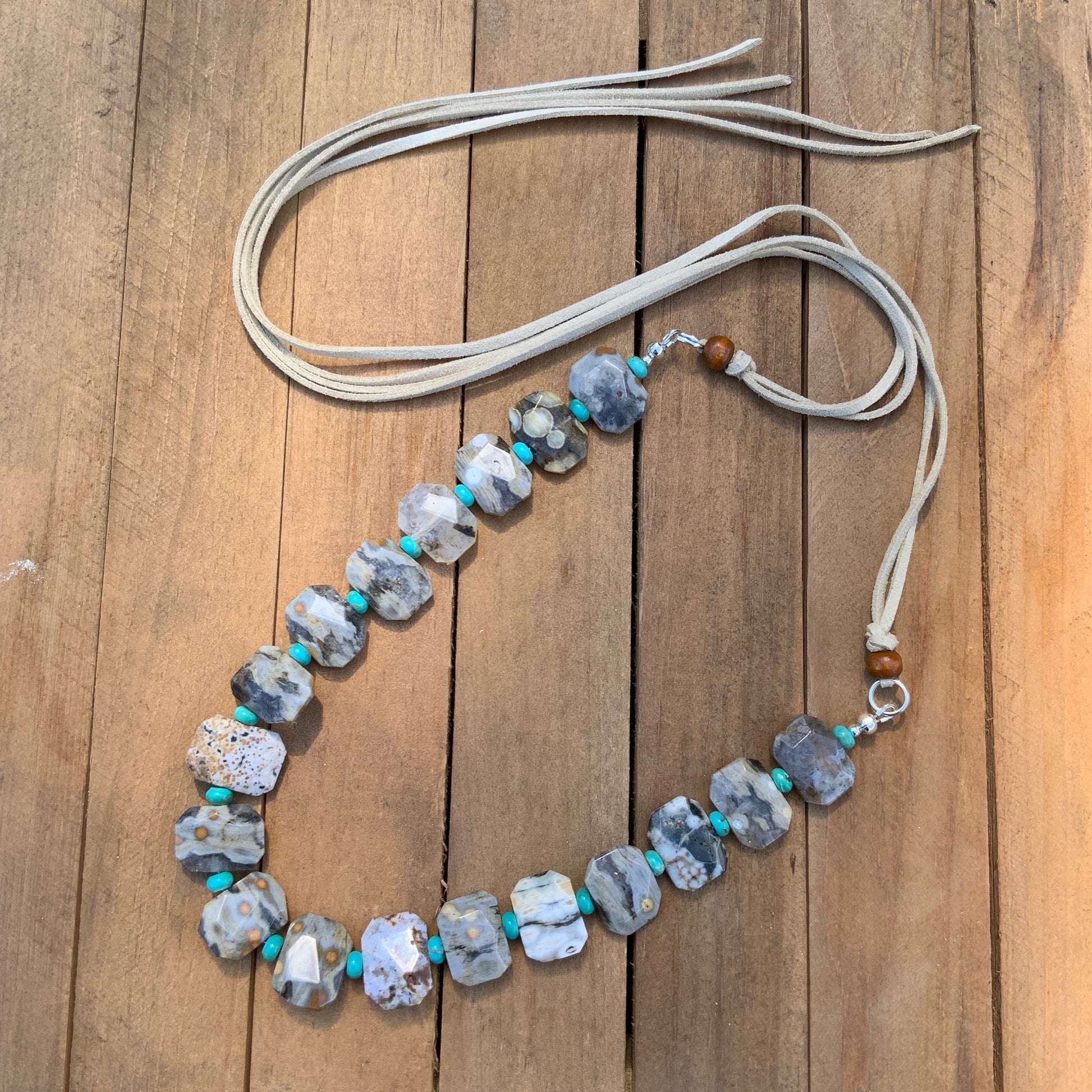 Handmade by Adriana using Ocean Jasper, turquoise, hematite, wood, and silver-plated beads on vegan suede cord.