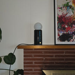 The Pillar Lamp is VESSEL's modern take on a living room essential. A large, dimmable incandescent light bulb sits atop a hand thrown ceramic base. Turn the brass knob to dim the warm light to your preference.