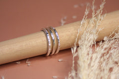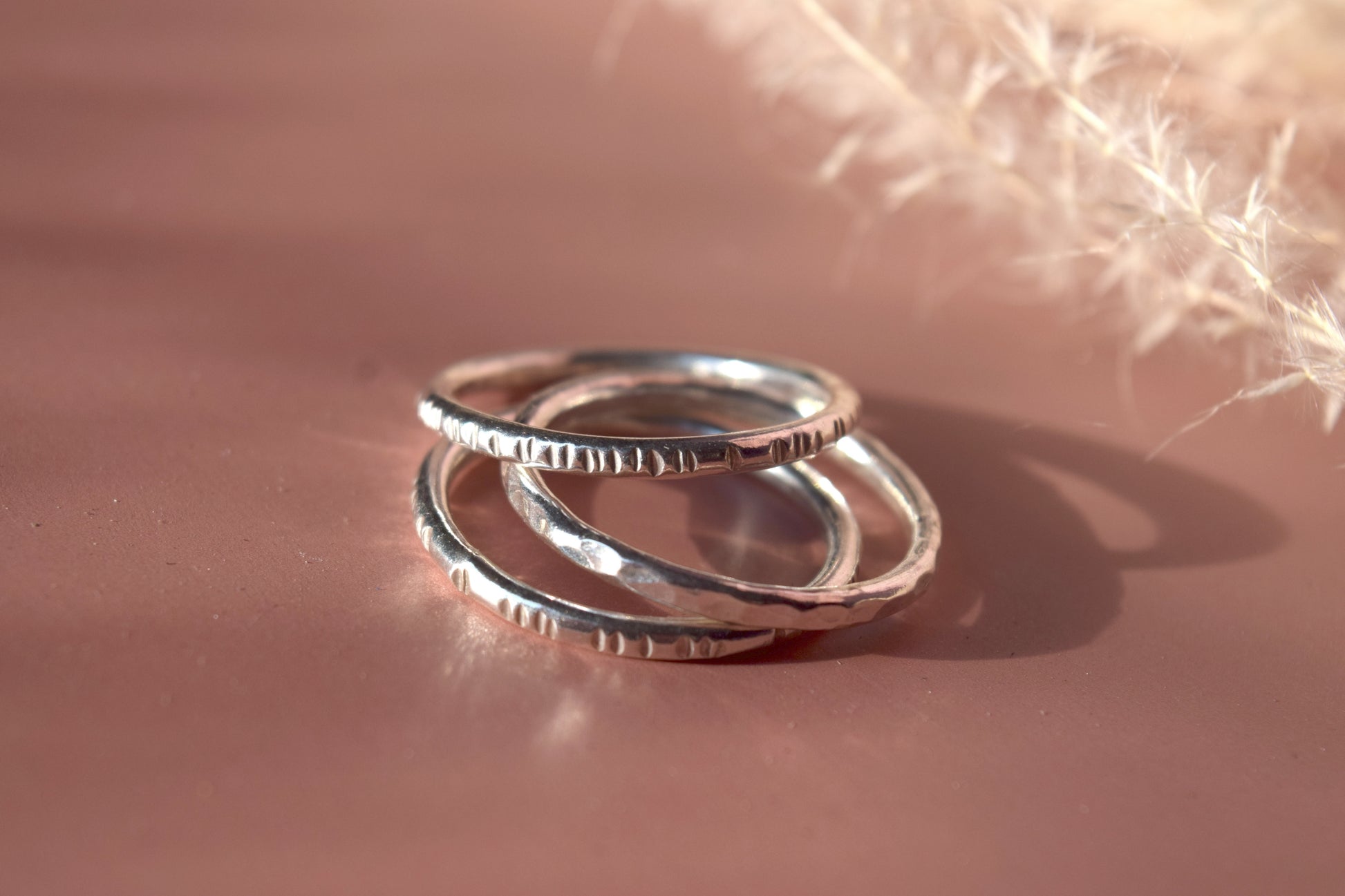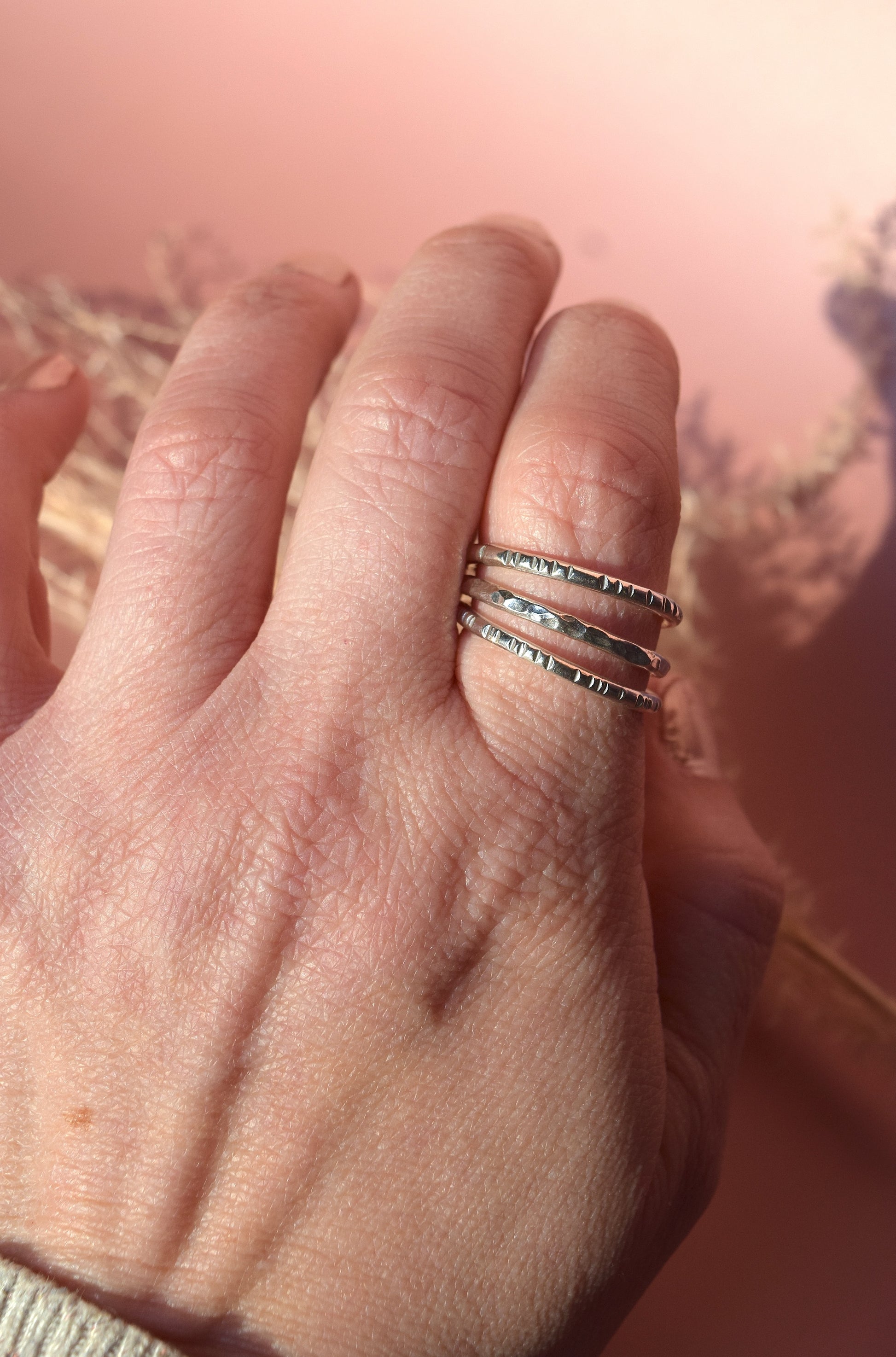 The ultimate stackable ring set, each ring can be worn individually, matched together, or mixed in with your favorite pieces. Every band is made with 100% recycled sterling silver and hammered by hand; the middle band mimicking flowing water running through 2 stately tree banks