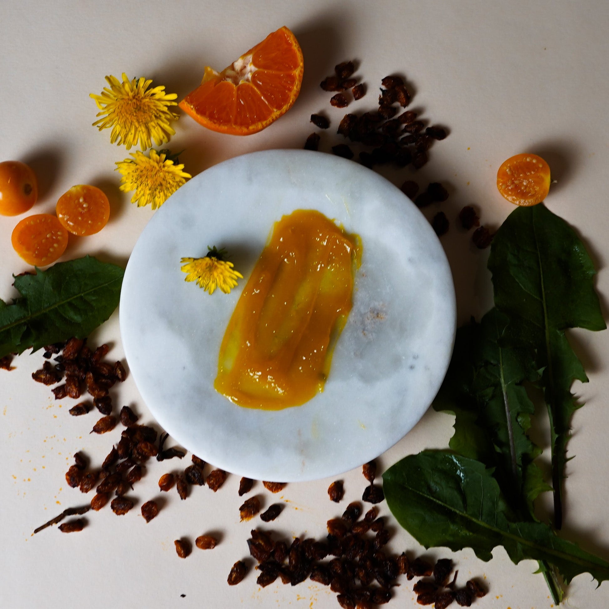 This cheery clementine-scented balm is a little pot of golden sunshine. Featuring plants like Dandelion, Rosehips, Sea Buckthorn, Amla, Raspberry & Pomegranate that are naturally high in vitamin C, this balm is brimming with antioxidants, essential fatty acids, & carotenoids that help revitalize, nourish, brighten, even skin tone & smooth appearance.